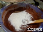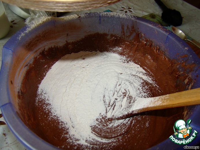 Затем добавляем просеянную муку и перемешиваем тесто до однородной массы.