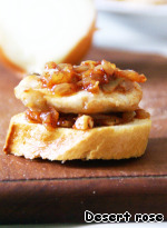 Нарезать куриное филе кусочками величиной чуть больше багетных ломтиков, толщиной 1 см. Чуть отбить. Посолить, посыпать красным молотым перцем и горчицей.