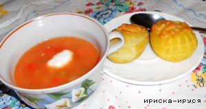 Супы должны всегда присутствовать в обеденном меню каждого маленького человечка, и мы, родители, какие только подвиги не совершаем, чтобы наше чадо супчик скушало! Мне удалось заинтересовать свою кроху картофелем, фаршированным филе курицы. Она с удовольствием съела картошечку, заедая ее супчиком.