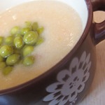 Суп готов. Треть картофеля и моркови вынуть из бульона и отложить. Добавляем в бульон на вошедшее в лапотки мясо и превращаем в пюре с помощью блэндера. В пюре добавляем отложенные овощи и горошек.