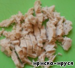 Отваренное филе вынимаем из кастрюльки, остужаем и измельчаем.