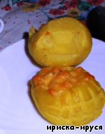 Пока супчик варится, займемся фаршированием картофеля. Сваренный в пароварке картофель очистим и придадим ему форму лаптей. Для этого вырежем ножиком серединку и сделаем бороздочки, имитируя переплетение. В углубление выкладываем измельченное филе.