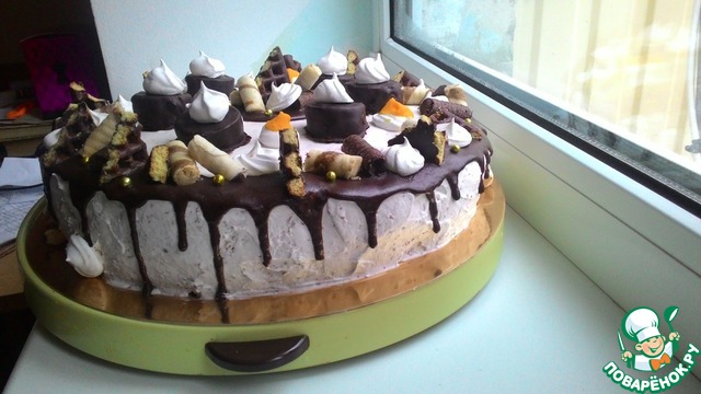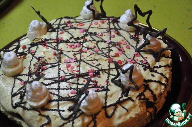 Приготовление этого торта незабываемо для меня. Дело было ночью,торт готовился для парня и чтоб не мешать родителям в своей комнате) Коржи получились отменные. А вот с взбиванием сливок вышел казус. Я купила польские сливки для взбивания, а в итоге у меня получилось масло. Вкусное, но масло) Я расстроилась, но не отказалась от приготовления торта. В итоге вместо взбитых сливок у меня был взбитый ванильный соус из икеи Он не застыл как положено,и его было маловато.. Получилось довольно вкусно и очень весело! Спасибо за рецепт. Думаю попробовать еще раз в менее экстремальных условиях