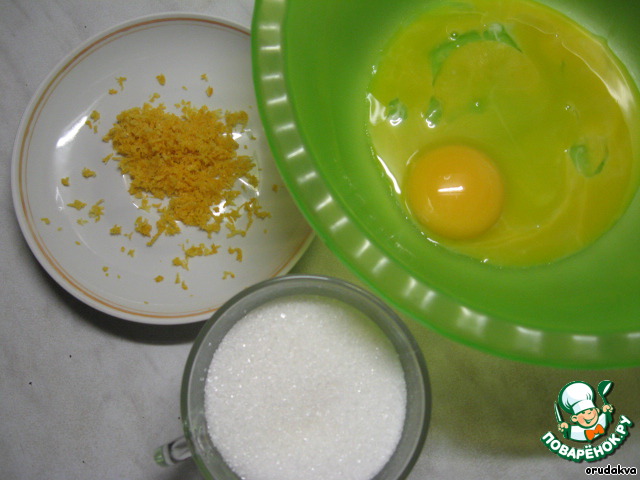 • Желтки взбить в крутую пену с 175г сахарного песка, ванильным сахаром и 1/2 ч. л. лимонной цедры.