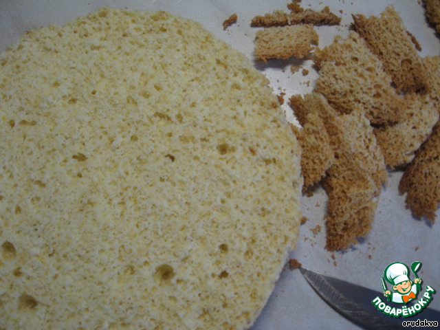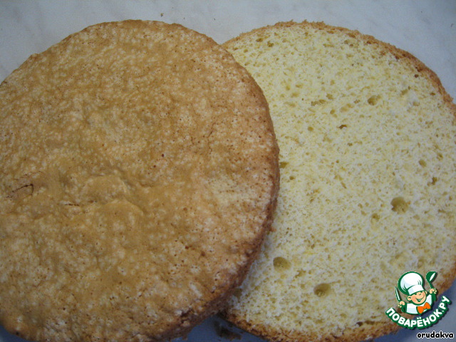 • Бисквит полностью остудить и разрезать по горизонтали пополам.