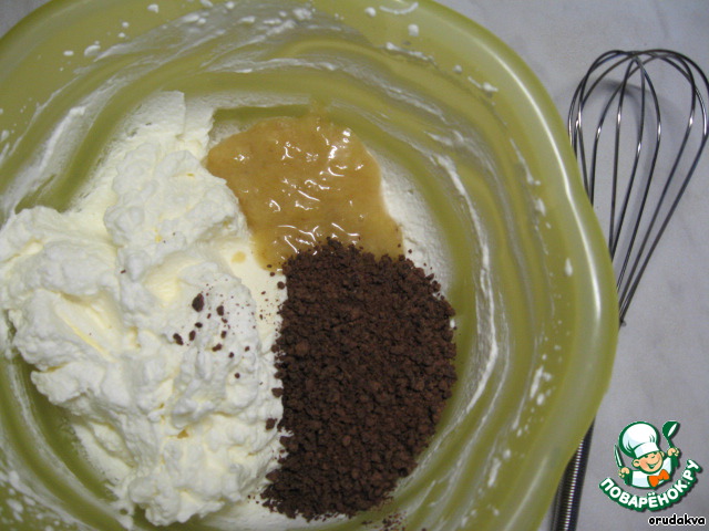 • Взбить сливки, добавить 5 ст. л. шоколадной стружки и банановое пюре.