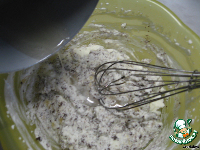 • Муку, крахмал и разрыхлитель смешать и просеять сверху на яичную смесь. Все осторожно перемешать.