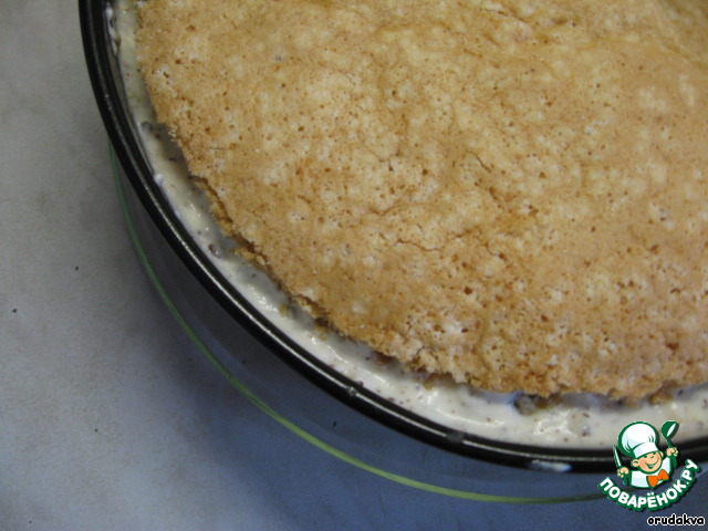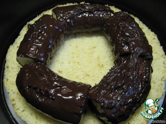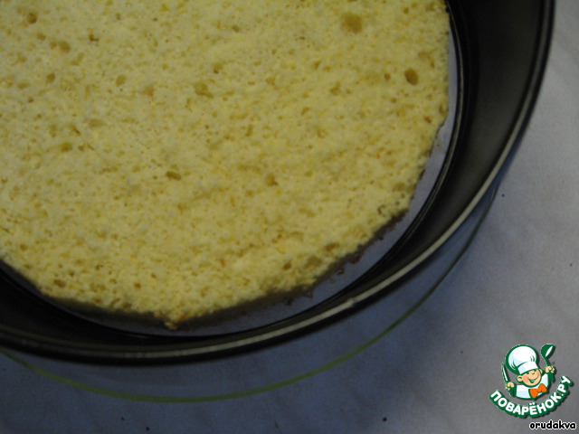• Нижний корж положить на блюдо и заключить его в кольцо для торта, оставив зазор в 1 см.