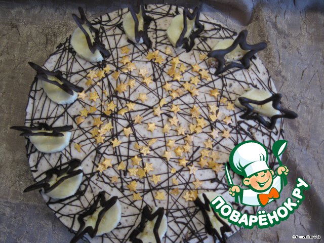 • В связи с форс-мажорными обстоятельствами у меня не осталось сливок для украшения. Поэтому вместо звездочек из сливок, у меня половинки кружочка банана, а над ними возвышаются наши шоколадные звезды. У кого сливки останутся, то 100мл сливок взбить, переложить в кондитерский мешок с насадкой в виде звездочки и отсадить звездочки-розочки по краю торта. И ещё, поверхность торта я посыпала кондитерскими посыпками в виде звездочек.