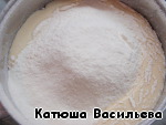 Затем массу снять с плиты и в неё просеять муку. Муки, главное, не переборщить, лучше потом добавить при раскатывании коржей.