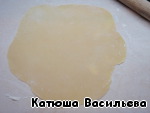 Когда тесто остынет, начинаем раскатывать коржи. Чуть присыпаем мукой стол, отщипываем от теста кусочек и раскатываем скалкой до толщины 5 мм, можно тоньше, коржи при выпечке ещё поднимутся.
