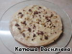 Каждый корж хорошо смазываем кремом. Сверху добавляем нарезанный кусочками шоколад. И посыпаем подсушенными в духовке или на сковороде орешками. -