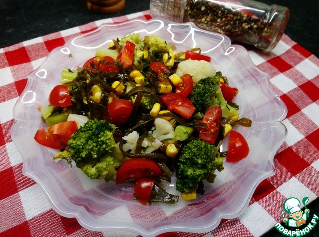 Добавляем к морской капусте отваренные брокколи и цветную капусту, помидор, консервированную кукурузу и укроп, заправляем оливковым маслом. Перемешиваем. Нет необходимости добавлять больше соли или каких-либо специй.