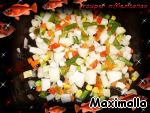 На оливковом масле поджариваем овощную мексиканскую смесь вместе с луком, не давая им подрумянится – всего пару минут. Солим. Перчим по вкусу. Никаких специй добавлять не стоит, так как овощи имеют очень богатый букет своих ароматов, очень даже аппетитных! Так что не стоит их чем-нибудь перебивать.