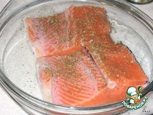 Выложить лосось в посуду для запекания, посолить немного. Смазать каждое филе соусом.