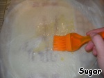 Лист теста фило (у меня круглый лист 34 см в диаметре, всего 8 листов теста фило) разрезаем на две части и смазываем его оливковым маслом.