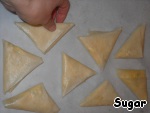 Застилаем противень бумагой для выпечки и выкладываем получившиеся треугольники. Смазываем их оливковым маслом.