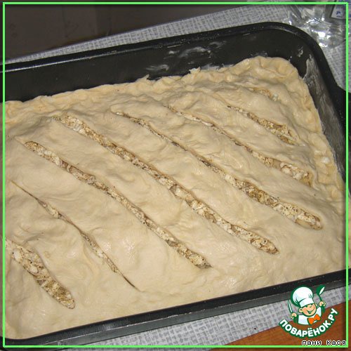 Растянуть вторую половину теста, прорезать ножом, укрыть сыр.