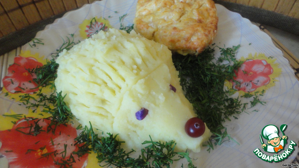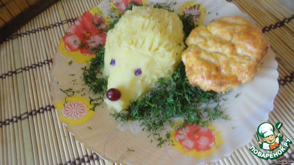 Из пюре я сформировала ёжика. Вилкой нарисовала "иголки", нос - клюковка, глаза - кусочки краснокочанной капусты. Вокруг ёжика посыпала укропчиком и положила рядом куриное суфле.