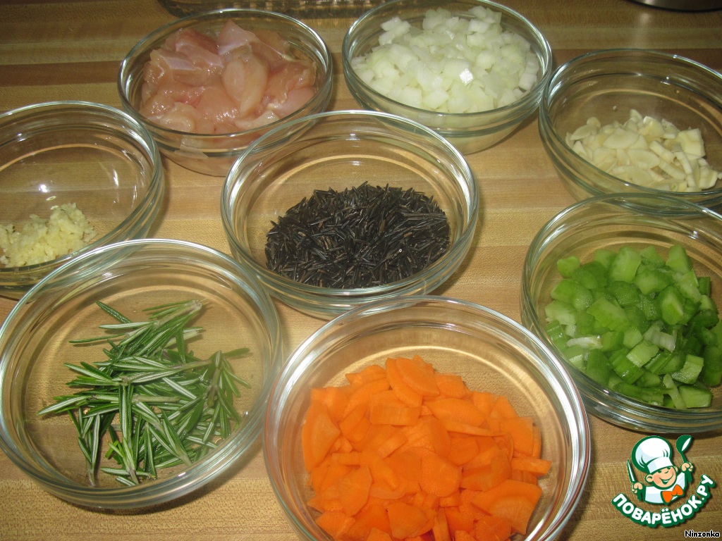 Куриную грудку, лук и сельдерей нарезать кубиками, морковь и пастернак почистить и нарезать кубиками, чеснок выдавить через чеснокодавилку. Рис промыть.