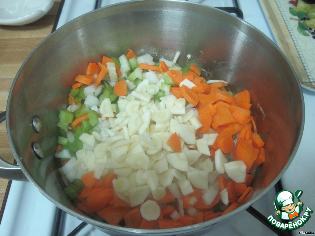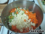 Добавить лук, чеснок, сельдерей, морковь и партернак и потушить примерно минут 5.