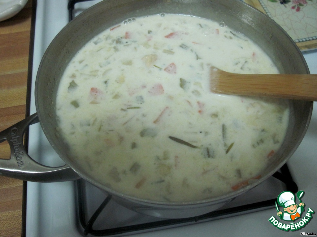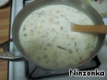 Затем добавляем сливки, перемешиваем, закрываем крышкой и выключаем газ.