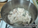 В кастрюлю с толстым дном налить масло, положить курицу и слегка обжарить. Примерно 4-5 минут.