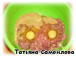 Фарш смешиваем с яйцами и сухарями, солим по вкусу.
