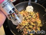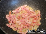 Добавляем грудинку и тоже обжариваем минуты 2-3.