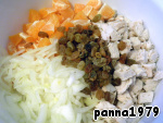 Куриное филе отварить в подсоленной воде, не остужая, нарезать маленькими кусочками. Мандарины очистить от кожуры и разделить на дольки. Автор рецепта предлагал еще очистить от пленок и семян. Я остановилась на удалении только семян. Дольки мандаринов порезать кусочками, примерно равными кусочкам курицы. Лук по рецепту был указан репчатый, его я и использовала, предварительно обдав кипятком, но советую использовать все же салатный. Итак, лук мелко нарезать. Изюм промыть и распарить.