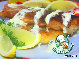 На тарелку выкладываем лепешку, сверху кусочек рыбы. Поливаем соусом, украшаем лимоном и зеленью. |