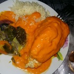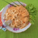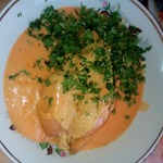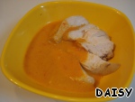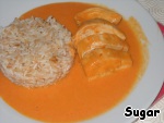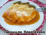 Сервировать надрезанные куриные грудки на кремово-овощном соусе. По желанию - подавать с гарниром (у меня в семье нашлось 2 желающих).