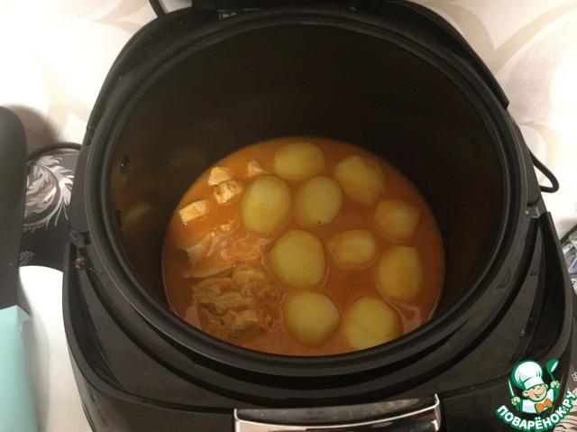 Добавить куриный бульон или воду, молотую сладкую паприку.