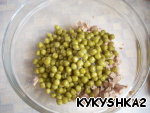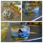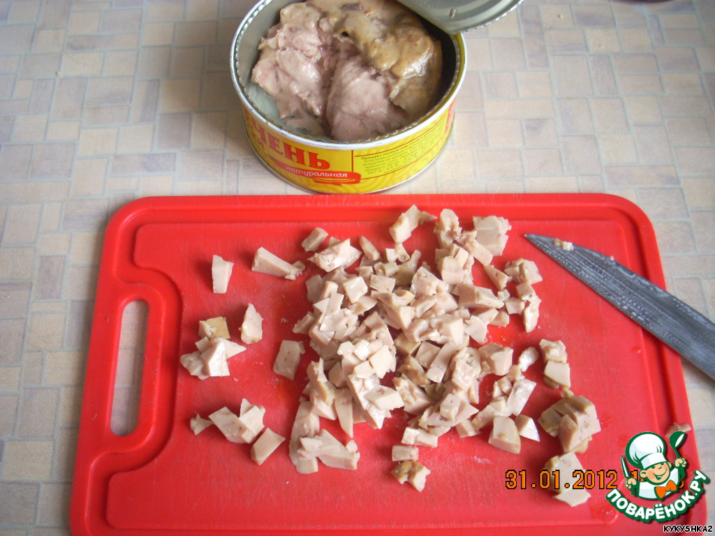 Открываем банку, масло сливаем. Печень режем на кусочки. Для красоты стараемся резать все одинаковыми кусочками, примерно размером с горошину.