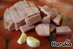 Ветчину нарезать кубиками. Чеснок измельчить.