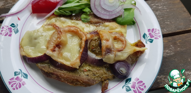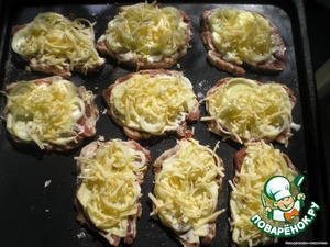 сверху мясо посыпать тертым сыром, на противень налить слегка воды (чтобы мясо не пригорело) и запекать в духовке при температуре 180 градусов 20 мин.