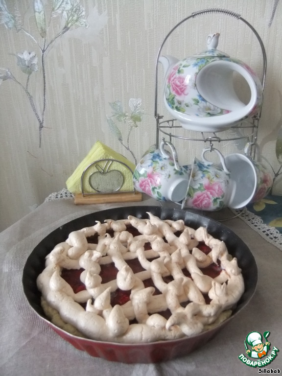 Сладкий домашний пирог с начинкой из вишни и решеточкой из безе. Значительное преимущество этого пирога перед другими в том, что приготовленная оригинальным способом начинка не течет.
