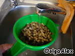После сливаем воду и промываем вареные грибы холодной водой, оставляем их в дуршлаге, чтоб стекла вода.