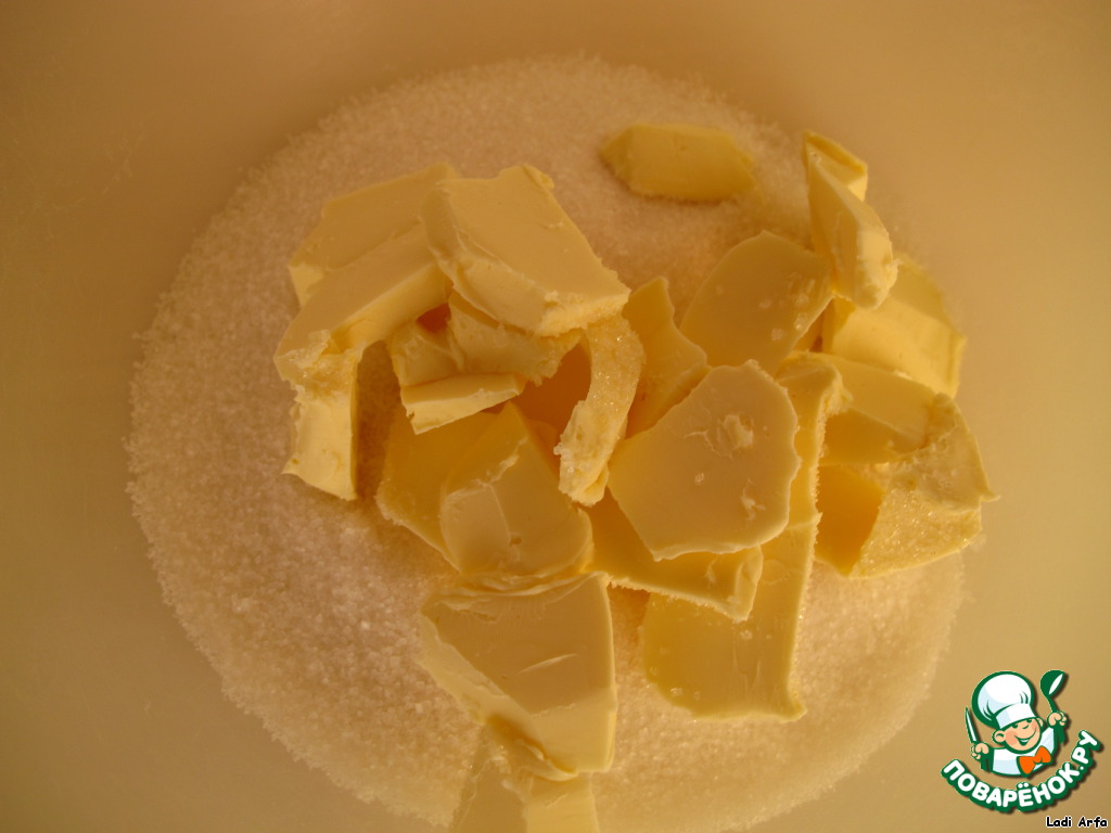 Сливочное масло растираем добела с сахаром и по одному вводим яйца.