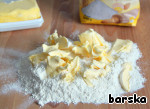 На рабочей доске просеять муку и добавить "хлопья" размягчённого сливочного масла. Перетереть их в "крошку".
