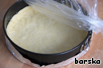 Тесто раскатать и выложить в подготовленную форму для выпечки, формируя небольшой бортик. Обязательно закрыть пакетом и отправить на холод минимум на 1 час!