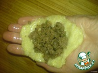 Пока варится каша на сковороде обжарить фарш с луком. Нашу чуть остывшую кашу необходимо превратить в почти однородную массу, перекрутить в мясорубке или в комбайне (я положила на стол и помяла руками, пока не стало однородным). Затем, смазав руки в растительном масле, взять немного нашего теста и расплющить его на ладошке.