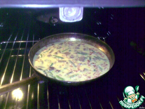 Поставить всю эту вкусноту в духовку и, посматривая, выдержать примерно полчаса, пока омлет не поднимется. Важно! во время запекания омлета не открывать дверцу духовки, иначе он осядет, и тогда Вам будет обидно: такой можно было бы и на простом огне за пару минут поджарить.