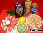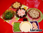 Креветки опустить в кипящую воду на 3 - 4 минуты, затем вынуть и очистить, шампиньоны и крабовые палочки нарезать кубиками, зеленый горошек поставить в микроволновую печь на 2 мин., затем слить воду, дикий рис отварить до готовности, зелень мелко нарезать.