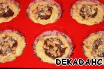 Выложить тесто в формочки для выпечки. Сверху положить чайную ложку пасты.