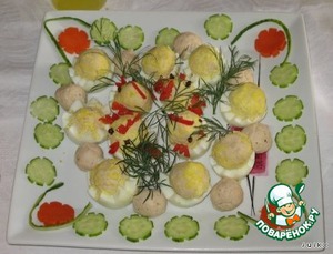Из куриной массы сделать валики, обсыпать их протертыми через сито желтками, украсить, т.е. вырезать из красного сладкого перца гребешки, крылышки, клювик и оформить цыплят. Из гвоздики делать глазки. Поместить в белки. Цыпочки готовы.