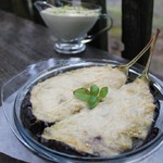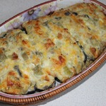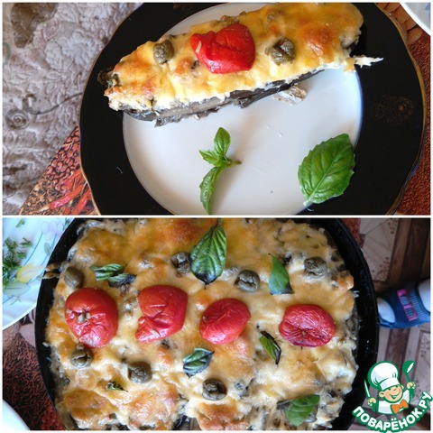 Так как я готовила всего один баклажан, но большой очень :) положила его в мини-формы. Если Вы готовите 6 штук, то конечно, их лучше выложить на большой противень. -