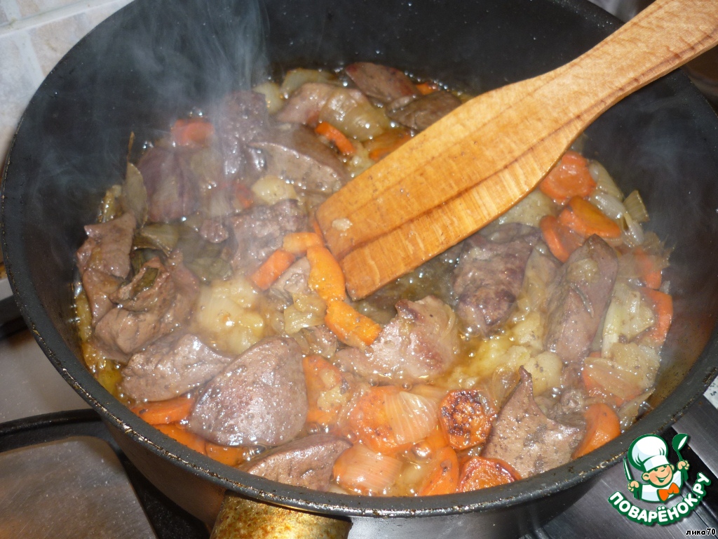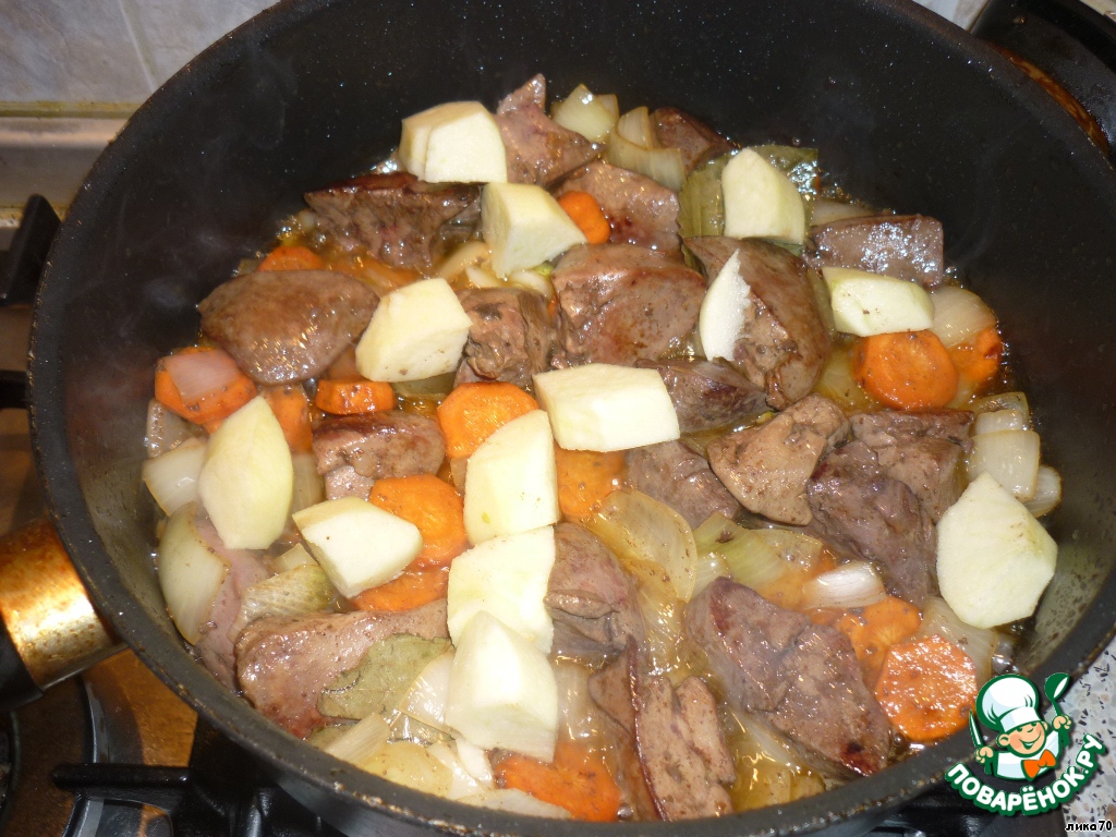 Печень, лук и морковь крупно нарезать и быстро обжарить в сотейнике на растительном масле с добавлением сливочного. Яблоко очистить от кожуры и сердцевины, нарезать крупно и добавить в сотейник.