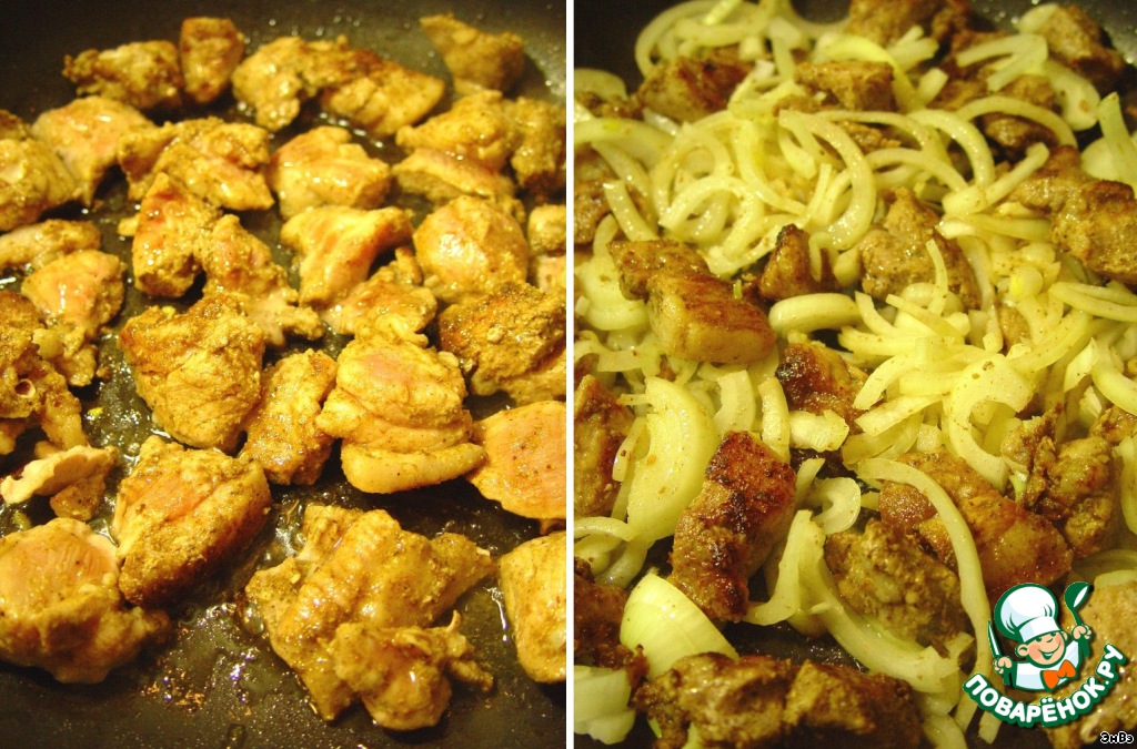 Замаринованное мясо выкладываем на горячую сковороду, обжариваем, за пару минут до готовности добавляем лук, солим и жарим до золотистого цвета. Снимаем со сковороды.