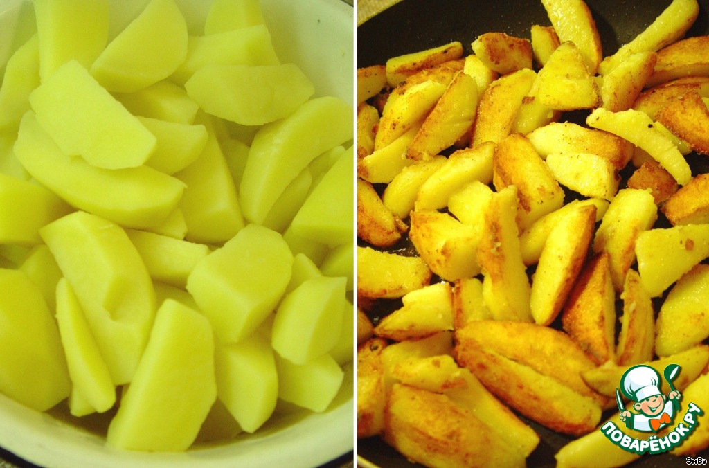 Параллельно с жаркой мяса отвариваем картофель. Опускаем его в кипящую подсоленную воду и варим до полуготовности (приблизительно 3 минуты после закипания), откидываем на дуршлаг и обдаем холодной водой. Когда мясо готово, на той же сковороде, где оно жарилось, жарим до полной готовности картофель, добавив при необходимости растительного масла. Картофель можно предварительно и не отваривать, но так, на мой взгляд, получается вкуснее.